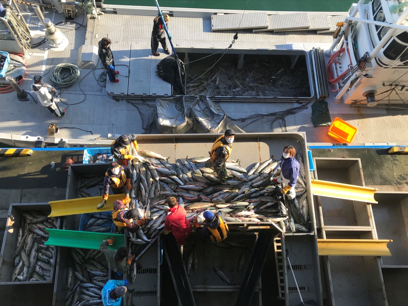 从阳台上可以看到渔船出港的样子,往下看的话可以看到鲑鱼从卸货开始的分类样子。